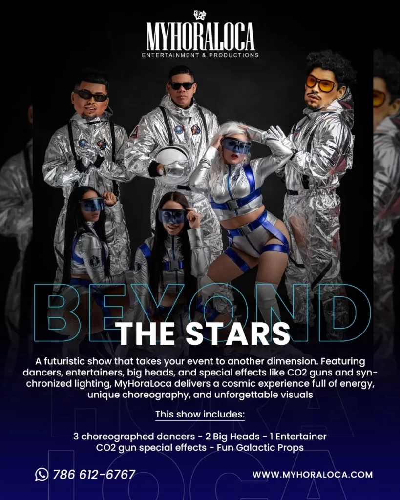 “Beyond The Stars” is our signature, high impact show a stunning fusion of lights, music, technology, and live performance. This production redefines the traditional Hora Loca, elevating your event to a cosmic level with LED robots, themed dancers, special effects, and a fully choreographed experience. Perfect for weddings, quinceañeras, corporate events, or luxury celebrations, this hora loca entertainment is designed for those who want more than just a party they want to make a statement. If you’re searching for hora loca near me or la hora loca near me, look no further than this unforgettable show featuring captivating hora loca dancers.